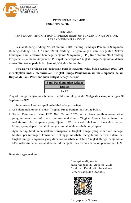 PENGUMUMAN NOMOR : PENG-5/DSPS/2025 TENTANG PENETAPAN TINGKAT BUNGA PENJAMINAN UNTUK SIMPANAN DI BANK PEREKONOMIAN RAKYAT Sesuai Undang-Undang No. 24 Tahun 2004 tentang Lembaga Penjamin Simpanan, Undang-Undang No. 4 Tahun 2023 tentang Pengembangan dan Penguatan Sektor Keuangan, dan Peraturan Lembaga Penjamin Simpanan (PLPS) No. 1 Tahun 2023 tentang Program Penjaminan Simpanan, LPS dapat menetapkan Tingkat Bunga Penjaminan di luar waktu ditentukan pada bulan Januari, Mei, dan September. Berdasarkan evaluasi dan penetapan periode sewaktu-waktu bulan Agustus 2025, LPS menetapkan untuk menurunkan Tingkat Bunga Penjaminan untuk simpanan dalam Rupiah di Bank Perekonomian Rakyat, sebagai berikut: Bank Perekonomian Rakyat adalah 6,25%. Tingkat Bunga Penjaminan tersebut berlaku untuk periode 28 Agustus sampai dengan 30 September 2025. Selanjutnya kami sampaikan hal-hal sebagai berikut: 1. LPS akan melakukan evaluasi Tingkat Bunga Penjaminan setiap bulan. 2. Sesuai Ketentuan dalam PLPS No.1 Tahun 2023, setiap bank wajib menempatkan pengumuman dan informasi tentang maksimum Tingkat Bunga Penjaminan dan maksimum nilai simpanan yang dijamin LPS pada seluruh kantor bank dan tempat lainnya yang dapat diketahui dengan mudah oleh nasabah penyimpan. 3. Agar setiap bank memastikan transparansi tingkat bunga yang diberikan sebagai bentuk perlindungan konsumen sehingga nasabah mengetahui bahwa dalam hal tingkat bunga simpanan yang diterima nasabah melebihi Tingkat Bunga Penjaminan LPS, maka simpanan nasabah tersebut menjadi tidak termasuk dalam penjaminan LPS.